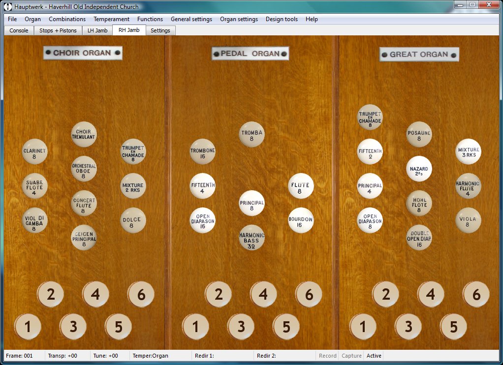 Two organ definition files (ODFs) are provided to cater for differing screen requirements, one requiring a display resolution of 1280 x 1024 with the alternative designed to run on the Hauptwerk minimum screen resolution of 1024 x 768.